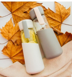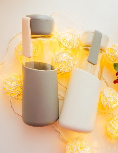 Die Flasche besteht aus hochwertigem Borosilikatglas, das besonders hitzebeständig ist und Temperaturen von 0°C bis 100°C standhält. Der Deckel ist aus lebensmittelechtem PP gefertigt, während die Schürze und Becherhülse ebenfalls aus lebensmittelechtem Kieselgel und Silikon bestehen – für Sicherheit und Haltbarkeit. Das Silikon schützt die Flasche vor Stößen und sorgt dafür, dass sie bequem in der Hand liegt.